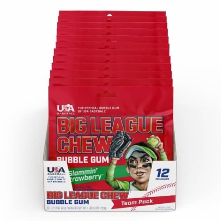 Big League Chew Strawberry~ Outta’ Here Original featuring a softball and baseball teammate shredded bubble gum. The Ball Players Bubble Gum. A whole lotta gum in every pouch with a great strawberry flavor!